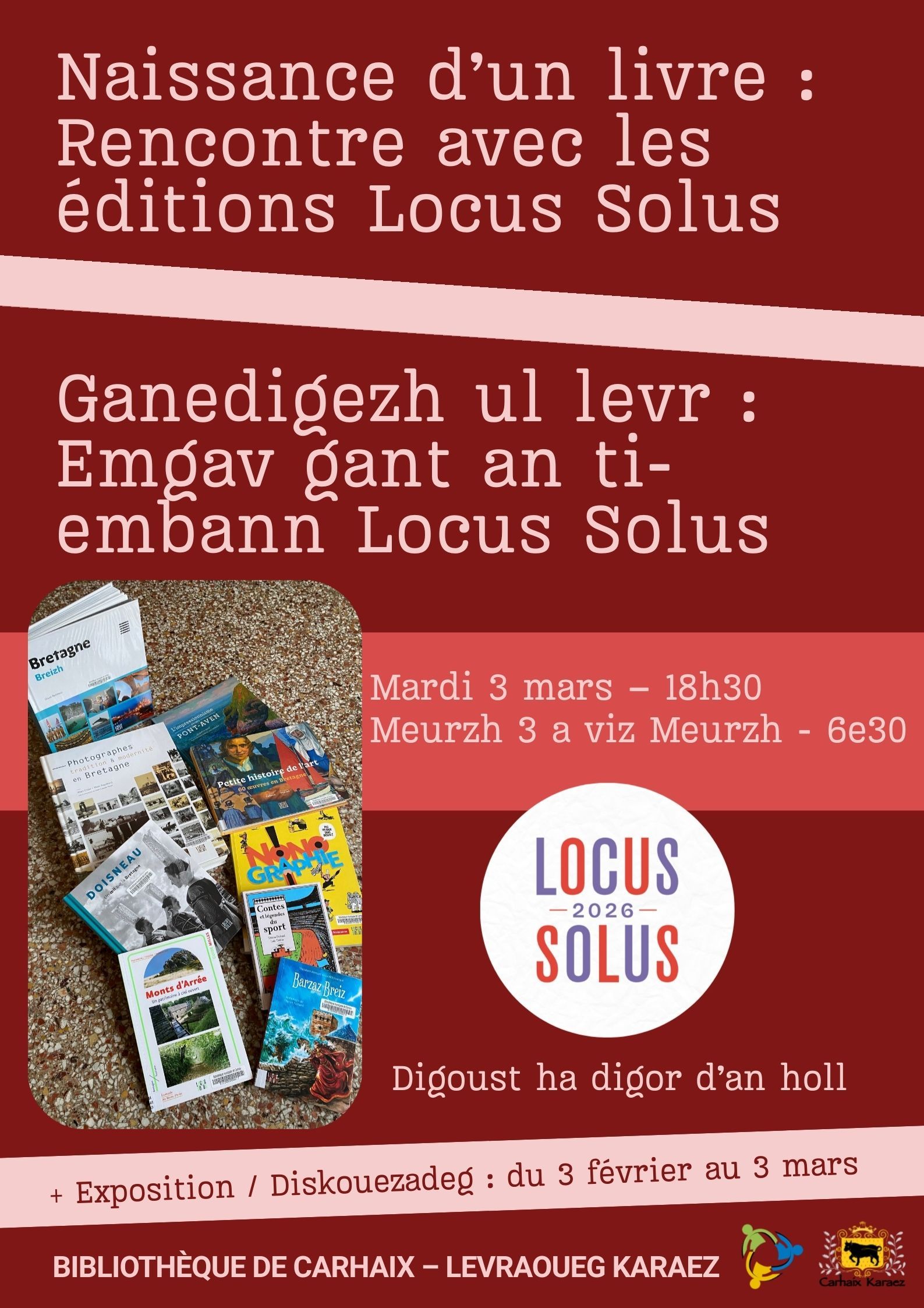 Cet évènement a lieu en parallèle de l’exposition « Naissance d’un livre » présente à la bibliothèque depuis le 3 février dernier et à l’occasion du mois du livre en Bretagne : https://www.moisdulivrebretagne.bzh//evenements/715-la-chaine-du-livre-et-ledition-en-bretagne